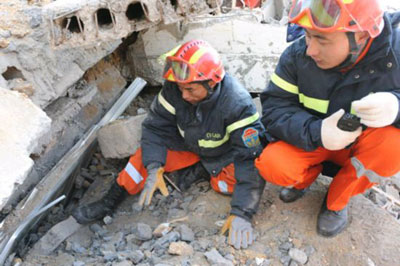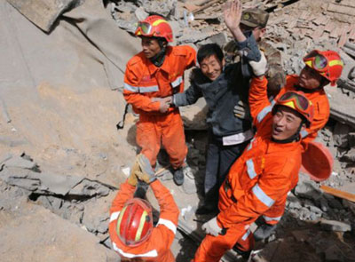 國家救援隊(duì)在到達(dá)玉樹機(jī)場后,救援隊(duì)員火速前往受災(zāi)最重的玉樹縣城結(jié)古鎮(zhèn)。全體救援隊(duì)員挑燈夜戰(zhàn),齊心協(xié)力營救出2名幸存者。雖初戰(zhàn)告捷,但救援隊(duì)員不敢絲毫松懈,因?yàn)閺U墟還有更多生命等待我們。只要有一線希望,我們就會(huì)盡百倍努力,“不拋棄,不放棄”。