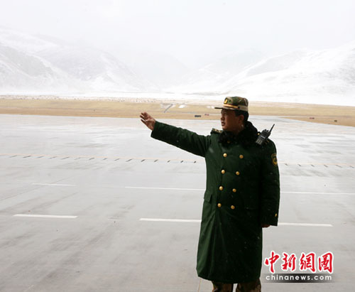 中新網(wǎng)青海玉樹4月22日電(石磊記者劉忠俊)22日5:10分,青海玉樹災(zāi)區(qū)陰云密布,天空下起大雪。為確保唯一空中生命線的暢通,武警青海總隊(duì)駐巴塘機(jī)場(chǎng)官兵加強(qiáng)機(jī)場(chǎng)安全保衛(wèi)工作。
