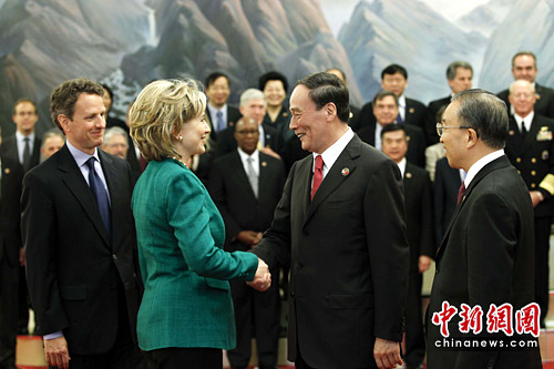 中新網(wǎng)北京5月24日電(記者 張蔚然)第二輪中美戰(zhàn)略與經(jīng)濟(jì)對話開幕式今天上午9時(shí)許在人民大會(huì)堂舉行。中國國務(wù)院副總理王岐山、國務(wù)委員戴秉國、美國國務(wù)卿克林頓、財(cái)政部長蓋特納出席。