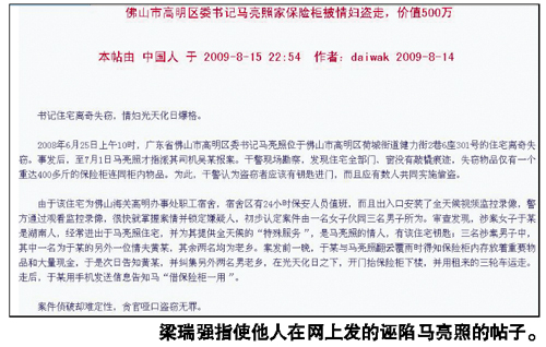 本報(bào)記者從權(quán)威人士處核實(shí),梁瑞強(qiáng)涉嫌的誣告陷害罪,與去年8月在網(wǎng)絡(luò)上舉報(bào)高明區(qū)委書記馬亮照的網(wǎng)帖有關(guān)。當(dāng)時(shí),在天涯、貓撲等知名論壇,不斷有人發(fā)帖稱馬亮照的宿舍一次就被洗劫500多萬元財(cái)物,違規(guī)使用專用賬戶資金等等,一時(shí)掀起軒然大波。警方立案調(diào)查背后的始作俑者,卻發(fā)現(xiàn)幕后黑手竟然是副區(qū)長梁瑞強(qiáng)。