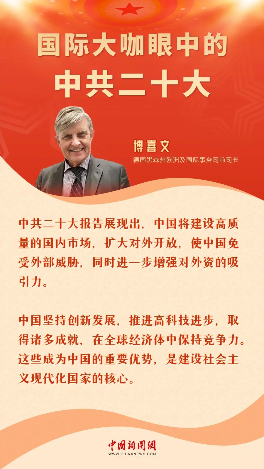 國際輿論表示中共二十大擘畫中國未來發(fā)展藍(lán)圖,為今后發(fā)展指明道路,為現(xiàn)代化建設(shè)奠定基礎(chǔ),并評(píng)論稱中國一定能實(shí)現(xiàn)奮斗目標(biāo)。