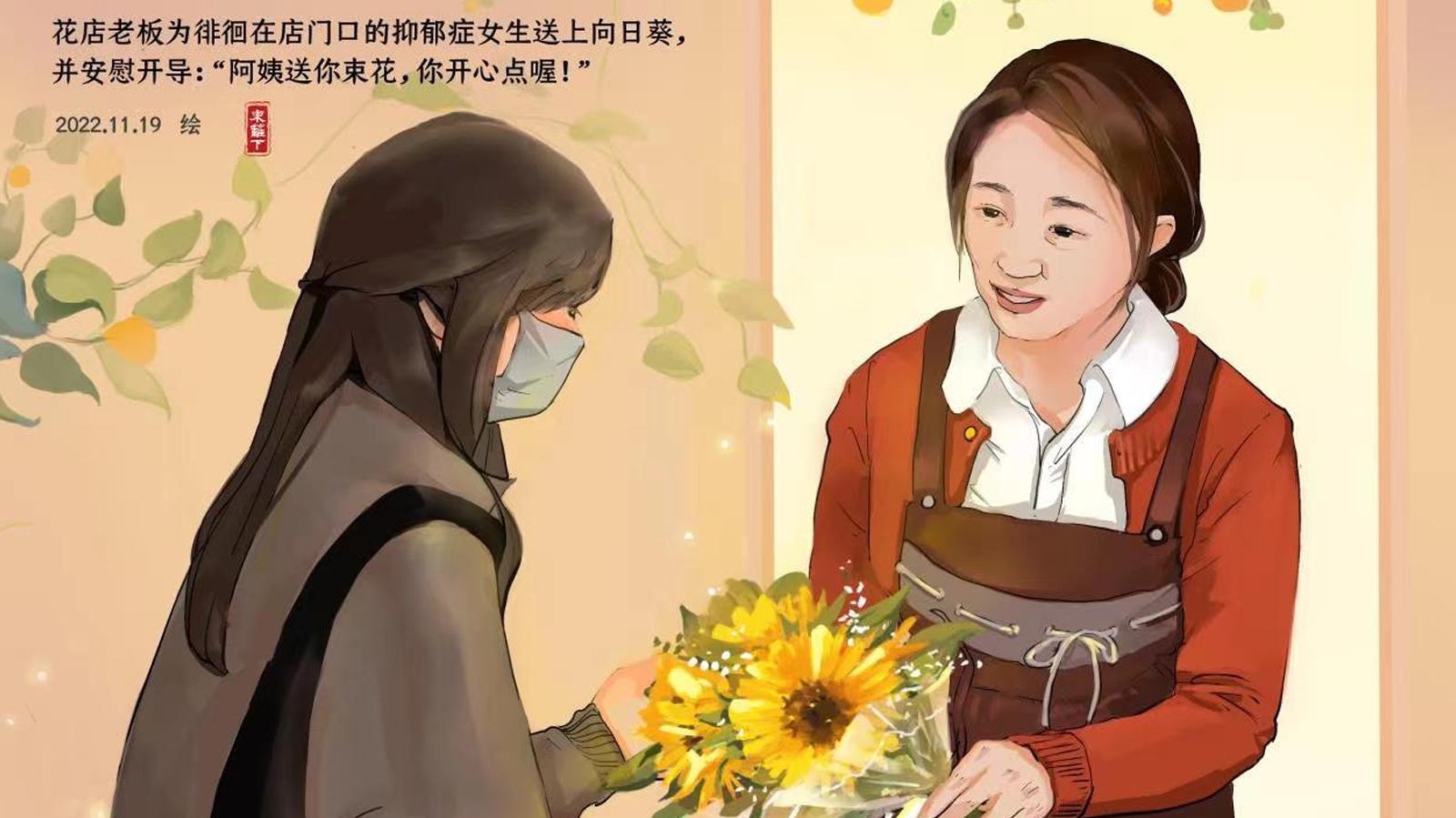 近日,廣西百色一名患抑郁癥的初中女生在一家花店門口徘徊,花店老板了解到情況后,主動給女孩送了一束向日葵并安慰開導。