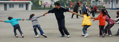 進(jìn)這所學(xué)校在去年的地震中,四層教學(xué)樓整體坍塌,473名學(xué)生中死了226名,47名老師死了22名。現(xiàn)在,這些從廢墟中被幸運(yùn)掏出來的孩子們,又重新活躍在臨時(shí)建成的學(xué)校操場上。他們跳著,跑著,笑著,嚷著,像一群嘰嘰喳喳的小鳥。