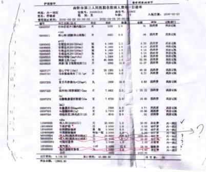 第一份清單是她母親席桂芬的。席桂芬今年80歲,是南陽市商業(yè)局的離退休干部,多年來患有高血壓、糖尿病、老年癡呆癥等,近年來經(jīng)常在南陽市第三人民醫(yī)院住院治療。清單顯示的時間為“2007年10月29日至30日(前日零點至次日零點,下同)”,李冰特意在兩行費用上用紅筆作了標記:一次性用品,單價10元,套數(shù)258套,合計金額2580元,類別為其他費用。也就是說,在醫(yī)療費用之外,席桂芬這一天揮霍掉了258套一次性用品。第二份清單上,時間為:2008年6月14日,其母親的性別變成了“男”。