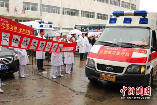 中新網(wǎng)蘭州4月21日電 (記者 張玉璽)4月21日,根據(jù)衛(wèi)生部安排,由蘭州大學(xué)第一醫(yī)院19名專(zhuān)業(yè)人員組建的甘肅省第4支赴青海玉樹(shù)災(zāi)區(qū)醫(yī)療救援隊(duì)自蘭州出發(fā)。這支醫(yī)療救援隊(duì)將接替甘肅省中醫(yī)院醫(yī)療隊(duì),承擔(dān)甘肅省醫(yī)療對(duì)口支援的玉樹(shù)縣哈秀鄉(xiāng)醫(yī)療服務(wù)工作。
