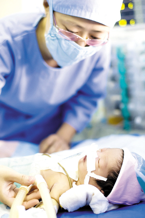中秋節(jié)前添了個小寶貝,全家人都很高興。然而秋秋出生后沒多久,中心婦產(chǎn)科新生兒科的醫(yī)生們就發(fā)現(xiàn)孩子的嘴唇以及全身上下都開始發(fā)紫,而且越來越厲害。于是,中心婦產(chǎn)科醫(yī)院立即借助和胸科醫(yī)院的合作關(guān)系,請來胸科醫(yī)院的醫(yī)生為秋秋作B超檢查,發(fā)現(xiàn)秋秋屬于紫紺型先天性心臟病,原本應(yīng)該連接左心室的主動脈移位,必須盡快進(jìn)行“修心”手術(shù),否則左心室便會萎縮、喪失正常功能,會有生命危險。這突如其來的打擊讓秋秋的父母痛不欲生,但小兩口仍然堅(jiān)信自己的孩子一定能挺過這道難關(guān),他們無論如何也要給孩子看好病。