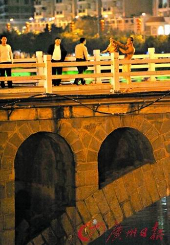 前晚,記者在事發(fā)現(xiàn)場看到,一個上身赤裸的男子情緒十分激動,一手“提”著小孩的腳,一手揮舞水果刀,站在橋欄旁將小孩甩來甩去,并時而將小孩“伸”出橋欄外。現(xiàn)場民警一邊與持刀男子展開對話,勸說其不要傷害小孩,一邊派熟悉水性的民警駕船到新豐江河中,以防萬一。20多分鐘后,經(jīng)當?shù)孛窬托膭裾f,該男子終于扔掉手中的水果刀,民警迅速包圍該男子將其擒住。(曾煥陽 李燕南 黃贊福)