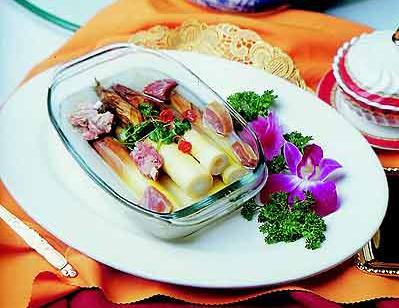 (5)春筍:被譽(yù)為“素食第一品”的春筍作為美味佳肴,自古以來(lái)備受人們喜愛(ài)。文人墨客和美食家對(duì)它贊嘆不已,有“嘗鮮無(wú)不道春筍”之說(shuō)。春筍筍體肥厚,美味爽口,營(yíng)養(yǎng)豐富,可葷可素。做法不同,風(fēng)味也各異,炒、燉、煮、煨皆成佳肴。地方名菜春筍均占一席之地,如上海的“枸杞春筍”,南京的“春筍白拌雞”,浙江的“南肉春筍”。不過(guò),北方很難吃到新鮮的春筍,如果是弗爾瑪林里泡過(guò)的就算了吧。