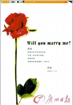 “婉君,Will you marry me?希望以后不用送你回家,而是一起回我們的家?——阿成”,為了趕在情人節(jié)前送女友一個難忘的感動,昨日,三水一位署名“阿成”的市民在本報(bào)三水金版上刊登整版求婚廣告,引起全城關(guān)注,求婚宣言讓許多市民大嘆“浪漫”,也好奇求婚記是否完美收場?記者找到了求婚者阿成和女主角婉君,還原甜蜜回憶。