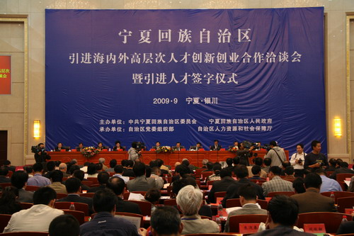 2009寧夏引進海內(nèi)外高層次人才創(chuàng)新創(chuàng)業(yè)合作洽談會9月7日下午在自治區(qū)首府銀川召開。此次洽談會聘27名院士、17名專家為“自治區(qū)特聘顧問”,宣布建立8家院士工作站和11家專家服務(wù)基地。自治區(qū)政府和一些單位與柔性和全職引進的專門人才簽署了相關(guān)框架協(xié)議、共建協(xié)議和聘用合同等。