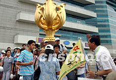 廣之旅三百人大型旅游團(tuán)六月十四日在香港金紫荊廣場(chǎng)拉開(kāi)香港游序幕,使該旅游景點(diǎn)人氣重現(xiàn)。潘索菲 攝