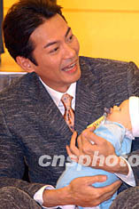 香港藝員江華,六月十五日在香港時代廣場舉行的歡度父親節(jié)活動上,風趣示范抱BB做運動一分鍾。錢興強 攝