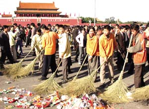 中新網(wǎng)10月4日電 據(jù)《京華時(shí)報(bào)》報(bào)道,由于游人“文明就差那么一點(diǎn)”,北京天安門(mén)廣場(chǎng)每天上10噸的垃圾讓環(huán)衛(wèi)部門(mén)有些不堪重負(fù)。