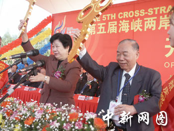 全國政協(xié)副主席張克輝與福建省委副書記、省紀委書記梁綺萍女士,在第五屆海峽兩岸(福建漳州)花卉博覽會開幕儀式上,共同轉動此次盛會的金鑰匙。蔡文原攝