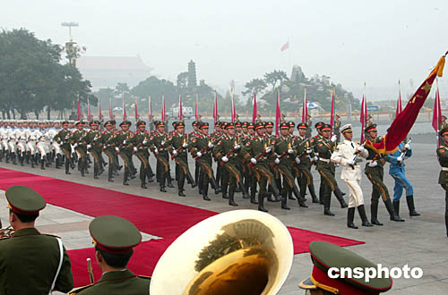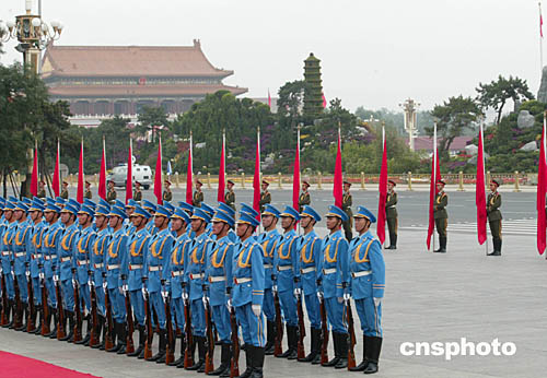圖為九月底解放軍三軍儀仗隊在北京人民大會堂東門外廣場在執(zhí)行一項外事檢閱任務(wù)。
