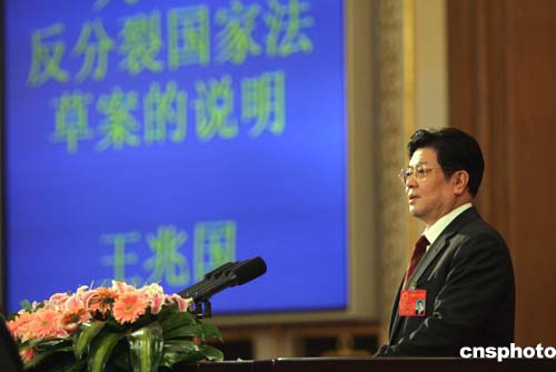 全國(guó)人大常委會(huì)副委員長(zhǎng)王兆國(guó)代表全國(guó)人大常委會(huì)在會(huì)上作關(guān)于反分裂國(guó)家法草案的說(shuō)明,介紹了制定本法的必要性和可行性、起草本法的原則和草案的形成以及草案的主要內(nèi)容。