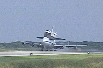 另?yè)?jù)報(bào)道,一架改進(jìn)型波音747專用運(yùn)輸機(jī)19日背著“發(fā)現(xiàn)”號(hào)航天飛機(jī)從美國(guó)加利福尼亞州愛德華茲空軍基地起飛,原計(jì)劃20日回到肯尼迪航天中心。但因天氣原因,“發(fā)現(xiàn)”號(hào)不得不在途中暫時(shí)歇息,推遲一天回家。