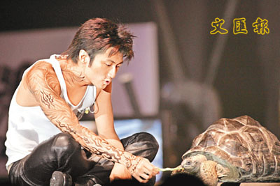 中新網(wǎng)8月23日電 據(jù)文匯報報道,達明一派與謝霆鋒首度合作的“同場異夢音樂會”,前晚在會展舉行,近年人氣不繼的霆鋒,為求搶鏡竟連家中的八十磅巨龜也要出動,又罔顧觀眾安危,突然飛身跳向觀眾席的觀眾,累及部分觀眾跌地上,幸好未有釀成意外。