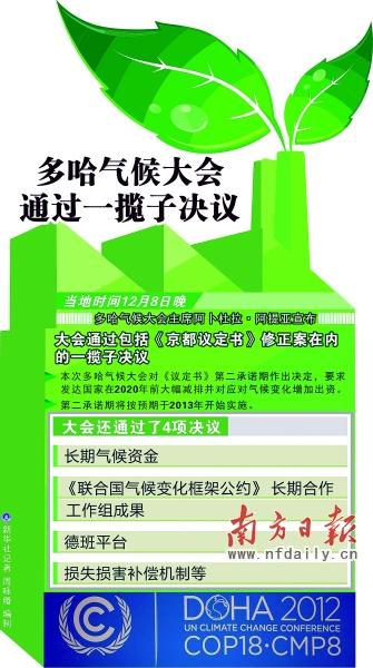 經(jīng)過一天一夜的“加時(shí)”鏖戰(zhàn),多哈氣候大會(huì)終于在當(dāng)?shù)貢r(shí)間8日晚上通過一攬子決議,戲劇般地落下帷幕。會(huì)議決定從2013年開啟《京都議定書》第二承諾期,為期8年。此外,會(huì)議還決定到2015年時(shí)達(dá)成一個(gè)涉及所有國(guó)家的有關(guān)2020年后全球應(yīng)對(duì)氣候變化行動(dòng)的協(xié)議,并重申發(fā)達(dá)國(guó)家應(yīng)當(dāng)為發(fā)展中國(guó)家應(yīng)對(duì)氣候變化提供資金支持。