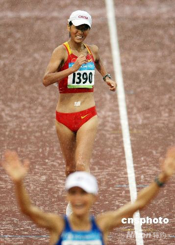 北京奧運會女子20公里競走8月21日上午在大雨中舉行,中國選手劉虹最終成績?yōu)?小時27分17秒,名列第四,無緣獎牌。中新社發(fā) 任晨鳴 攝