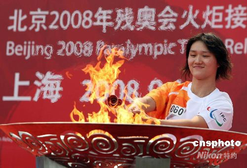 九月一日,北京殘奧會(huì)火炬接力“時(shí)代風(fēng)采線”第三站傳遞活動(dòng),在上海松江新城大學(xué)園區(qū)進(jìn)行,共有六十名火炬手參加。其中,殘疾人員有10名,其余為助殘、幫殘的先進(jìn)代表和基層殘疾人事業(yè)工作者。在北京奧運(yùn)會(huì)游泳比賽中獲得一銀兩銅佳績(jī)的上海運(yùn)動(dòng)員龐佳穎,參加火炬接力活動(dòng)。 中新社發(fā) 湯彥俊 攝