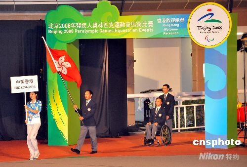 九月六日,北京二零零八年殘奧會馬術(shù)比賽開幕式在香港舉行歡迎晚會,香港殘奧馬術(shù)選手葉少康在運(yùn)動員入場式上進(jìn)場。中新社發(fā) 鄧慶樂 攝