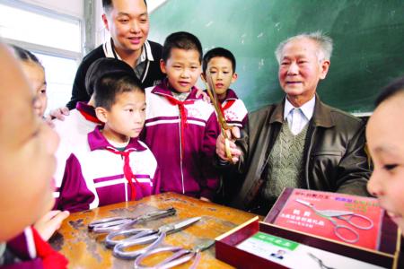 “同學(xué)們會不會說福州話。俊备V蓦娨暸_《攀講》節(jié)目主持人“土豆”發(fā)問了!拔視!我會!”孩子們的情緒馬上高漲了起來,紛紛舉手,表示自己是個(gè)小小福州人!罢l知道我們福州的傳統(tǒng)手工藝有哪些?今天,我們給大家介紹三位傳統(tǒng)手工藝的傳人,首先是剪刀狀元!”在孩子們的掌聲中,“鄭興利”剪刀的第三代傳人鄭德官走上講臺,八十高齡的他首先拿起一把剪刀,為孩子們講起有關(guān)“福剪”的往事。同學(xué)們被新奇的故事吸引了。鄭老又拿出幾把自己生產(chǎn)的特色剪刀,有的剪刀頭鑄成圓弧狀防止傷人,有的剪刀小巧可愛,有一把剪刀做成了一只仙鶴的形狀。