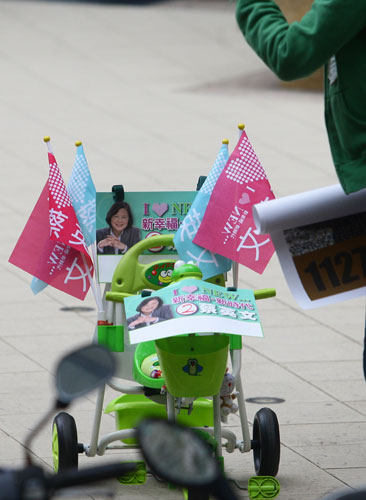 圖:兒童車插“五都”競(jìng)選旗子成另類宣傳車