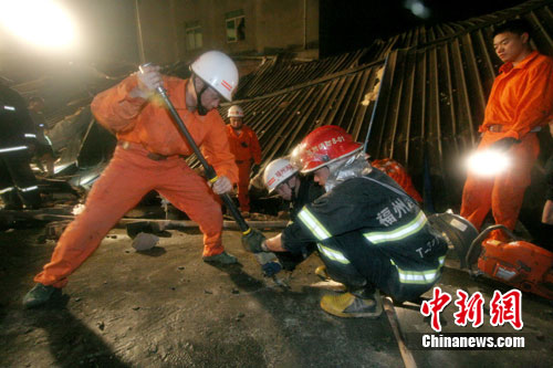 18時36分,消防官兵從房屋廢墟中救出3名被埋人員;