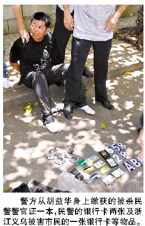 胡益華作案后十分殘忍冷血,殺人后還不忘搜索受害者身上有價(jià)值的物品,以便攜帶潛逃。據(jù)警方通報(bào),胡益華歸案后,除了從他身上搜出槍支外,還從他身上搜出廣東被殺民警警官證一本,民警的銀行卡兩張及浙江義烏被害市民的一張銀行卡。