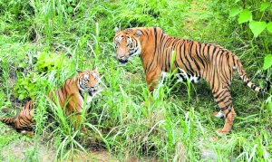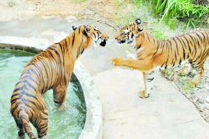 廣東省唯一的華南虎馴養(yǎng)繁殖基地——“粵北華南虎馴養(yǎng)繁殖研究中心”飼養(yǎng)的兩只國寶級成年華南虎“公主、王子”,自今年3月10日初婚洞房后,至今仍沒有懷孕跡象。昨天上午,在本報(bào)記者的見證下,研究中心決定實(shí)施第二階段的繁育試驗(yàn)——讓公主與王子雙雙再入洞房,然后零距離長時(shí)間生活培養(yǎng)感情增加懷孕幾率。