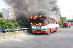 早8點(diǎn)35分,北京市東南三環(huán)華威橋南側(cè)一輛638路公交車發(fā)生自燃,司機(jī)在發(fā)現(xiàn)危險情況后立即將公交車?枯o路安全地帶,疏散車內(nèi)乘客,并報(bào)警,8時50分,公交車大火被消防員迅速撲滅。