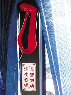 一輛車上,司機(jī)自帶一把安全錘,司機(jī)駕駛座位附近設(shè)有一把安全錘,每隔一個車窗也有一把安全錘。一般來說,南京每輛公交車上都有五把安全錘。