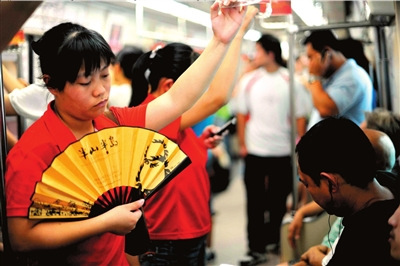 昨天上午8點(diǎn)多,記者擠在1號(hào)線“風(fēng)扇車(chē)”里,用手抹了一把臉上的汗水。從四惠東站到國(guó)貿(mào)站,這樣的動(dòng)作重復(fù)了十多次。車(chē)廂內(nèi)的乘客,有的臉上掛著焦灼的表情,不時(shí)用手扇風(fēng),有的小心翼翼地避免和他人身體接觸,以免黏著汗水,有的用手輕捂著鼻子,試圖避開(kāi)周?chē)暮钩粑丁?/p>