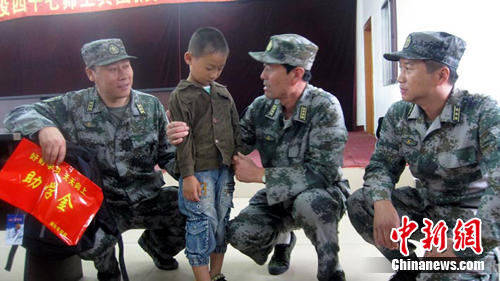 師長張寶軍說,救下男孩后,部隊忙于救人,與男孩失去聯(lián)絡。這段時間以來,張寶軍對男孩極為牽掛,他希望找到這個“光屁股”孤兒,了卻一樁心愿。8月22日上午10時,在旺起鎮(zhèn)小學,張寶軍終于見到了“光屁股”男孩張官博,他輕輕將男孩抱起,告訴他要堅強,要樂觀,要好好生活!拔視詡人的名義,一直資助你上大學,你記住爺爺?shù)脑,要堅強!睆垖氒娧劬駶,卻堅定的看著“光屁股”男孩。(完)