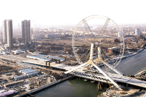 昨天上午,在永樂橋施工現(xiàn)場周圍,即將合龍的永樂橋摩天輪吸引了眾多市民的目光。記者了解到,目前,永樂橋摩天輪的結(jié)構(gòu)安裝已接近尾聲,將于本月18日正式合龍。屆時(shí),氣勢恢弘的“天津之眼”將完全“睜開”,為津城再添一景。