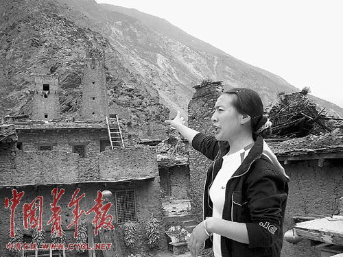 桃坪羌寨的羌族人掛念著附近山頂?shù)募焉秸?00多戶羌人的安危,有人從山上帶下來的消息說,上面房屋垮塌嚴(yán)重,有兩名正在房頂曬玉米的老人不幸罹難。