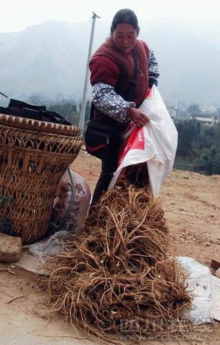 40多歲的魏永珍是任家坪村人,她麻利地將麻袋中還粘著泥土的當歸倒出來任人挑選,以1.5元/斤的價格賣出。這個價格,是去年同期他們賣給下鄉(xiāng)收購“小老板”的批發(fā)價。他們所在的地段,不斷有游客走過,走到北川老縣城外的“新三倒拐”看地震遺址,很多人會停下來買些當歸。屢次來此買過當歸的王師傅說,這里的當歸味道很正,有一種純正的甜味。魏永珍笑嘻嘻地說:“我們這里當歸好,路過的人都來買,生意多好!币换仡^,她指著遠處大面積的山說,地震已讓家園盡毀,原來用于種當歸的地都毀得差不多了:“本來可以產600斤左右,現(xiàn)在就剩了點邊角了,差不多只有100斤左右!