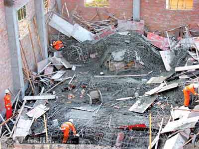 1月8日下午3時50分左右,14名施工者正在樓頂澆灌混凝土封頂,在沒有任何預(yù)兆的情況下,200多平方米的樓頂轟然墜落,毫無防備的14名工人隨之墜落。