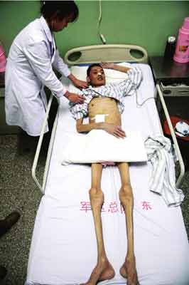 昨天下午,記者在軍區(qū)總院普外科病房見到了耿松峰,他雙臂向上彎曲放在枕邊,右側(cè)肩部正進(jìn)行靜脈營(yíng)養(yǎng)注射,一袋普通塑料袋大小的乳白色液體已經(jīng)見底。他說(shuō)話吃力,但仍然翕動(dòng)著嘴唇說(shuō):“伯伯(指普外科主任)是個(gè)好人!鄙砀1.72米、體重曾60公斤的他現(xiàn)在只有33公斤,大腿也只有成年男性手腕粗。他母親用極不流利的普通話說(shuō),因?yàn)閮鹤拥牟,已?jīng)家徒四壁,親戚、高利貸,各種借錢的方法都想到了,已經(jīng)花了20多萬(wàn),可還是不夠,兒媳也因此要離婚!艾F(xiàn)在已經(jīng)欠醫(yī)院5萬(wàn)塊錢了,可我也不能看著兒子死啊”。