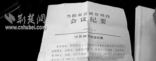遺體火化當日,當陽市公路段召開月度工作會,以紅頭文件印發(fā)的《會議紀要》決定:拿出一萬元獎勵在事故處理過程中“表現(xiàn)突出”的同志,分別為:劉某1000元;朱某、代某、劉某各500元;余某、文某及路政、超限站人員5000元;張某及養(yǎng)護公司人員1000元;機關(guān)維穩(wěn)人員1500元。