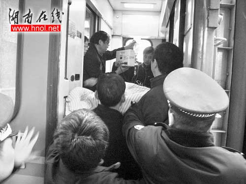 昨日下午4時(shí)40分,株洲火車站原定?慷九_(tái)的廣州開往成都的K193次列車緩緩駛進(jìn)一站臺(tái)。站臺(tái)上,從一輛早已等候在此的救護(hù)車上,醫(yī)生、民警和患者家屬合力抬下一副擔(dān)架登上列車。擔(dān)架上躺著一名戴著呼吸機(jī)、處于重度昏迷的患者。