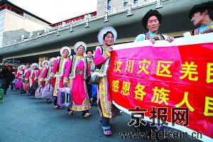 在排練基地,有26名穿著羌族服裝的演員非常引人注目,他們都是來自汶川、茂縣等地震重災(zāi)區(qū)的村民,昨天中午1時(shí)剛剛抵達(dá)北京。