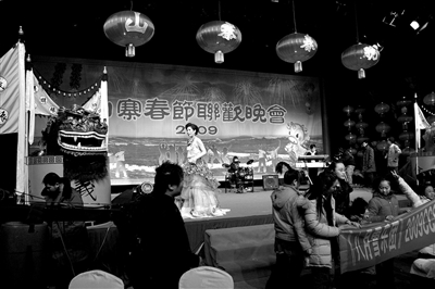 昨天下午5點左右,老孟一反日前對媒體三緘其口、“神秘化”的姿態(tài),通知各家媒體,山寨春晚在朝陽區(qū)勝古莊社區(qū)冶金研究所內(nèi),首次帶妝彩排。記者趕到后看到,山寨春晚現(xiàn)場布置得有模有樣——前后兩個舞臺,多角度燈光和完善的音響設(shè)備,5機位拍攝全景、特寫和觀眾表情,甚至還有一架搖臂多角度拍攝演員,儼然是一場專業(yè)水平的晚會。