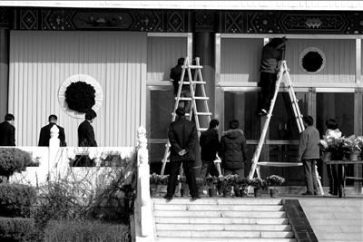 昨天,工作人員正在告別廳外進(jìn)行布置。今天上午10時(shí),在央視大火中犧牲的張建勇烈士遺體告別儀式將在八寶山殯儀館舉行。昨天,十多名身著制服的消防官兵整齊地進(jìn)入殯儀館東禮堂內(nèi),布置送別禮堂。