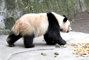 記者發(fā)現(xiàn),幾只熊貓的白色毛基本都有泛黃現(xiàn)象,特別是背部和尾部特別明顯。記者介紹網上帖子內容后,飼養(yǎng)員張乃成介紹說,重慶潮濕陰雨的天氣,是造成熊貓毛色泛黃的原因之一!靶茇埾矚g在地上玩耍,免不了會沾上泥土灰塵!睆埬顺煞Q,根據(jù)熊貓毛色的干凈程度,飼養(yǎng)員會不定期為它們洗澡,但毛色是洗不掉的。冬季熊貓毛色不如夏季看起來那么亮,3、4月份換毛后,看起來就干凈多了!