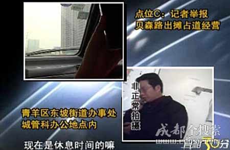 近日,成都電視臺《真相30分》欄目組接到神秘舉報電話。對方舉報城管收取好處費,對出攤占道視而不見。對此,記者專門進行了暗訪。成都全搜索網(wǎng)站記者通過影像資料發(fā)現(xiàn),城管執(zhí)法人員不僅有對出攤占道經(jīng)營故意睜一只眼閉一只眼的嫌疑,還暴露了城管管理缺失的問題。