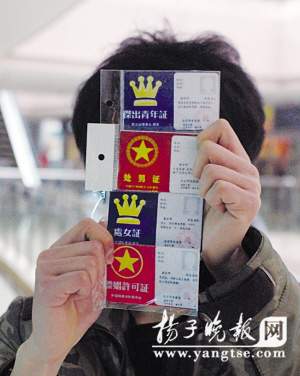 昨天,記者在常州南大街商業(yè)步行街的一家商鋪里看到,一些彩色的塑料卡片竟然印上了“嫖娼許可證”、“處男證”等刺眼字樣。記者看到,在一張“嫖娼許可證”的左半部分紅底黃字,不僅寫有“嫖娼許可證”的字樣,還煞有介事地印上了“網(wǎng)絡(luò)奸淫委員會”字樣;右側(cè)為白底黑字,姓名、年齡、性別等一應(yīng)俱全。采訪中不少市民表示,這樣的惡搞卡片實(shí)在有些低級趣味,很容易對小學(xué)生以及青年人產(chǎn)生不好的影響。
