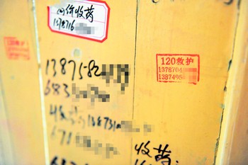 記者還在該院男、女廁所的門板、瓷磚、水管等處看到遍布的“救護(hù)車接送病人”、“出院用車”、“包車”、“病人接送車”、“120救護(hù)”等不同字樣的廣告標(biāo)貼,上面的所有電話都是私人手機(jī)號碼,個別廣告標(biāo)貼上甚至還配上了車輛圖片,顯得“很真實”。