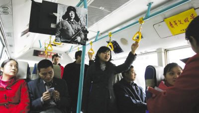 記者在車上觀察發(fā)現(xiàn),幾乎每個(gè)乘客走進(jìn)601車車廂時(shí),都會(huì)將目光停留在雷鋒照片上,有人還會(huì)喃喃自語(yǔ):“又到學(xué)雷鋒日了呀”。似乎并不是每個(gè)乘客都認(rèn)識(shí)或了解雷鋒。10點(diǎn)過(guò),3個(gè)初中生模樣的男孩走上車,看見(jiàn)雷鋒照片后忍不住發(fā)問(wèn):“這是誰(shuí)呀?”當(dāng)售票員讓他們猜猜時(shí),一名叫杜宇的男孩竟稱“他穿了軍裝拿著槍,是不是董存瑞?”這幾名自稱是長(zhǎng)壽區(qū)的孩子表示,他們都是初二的學(xué)生,此次隨父母從廣東轉(zhuǎn)學(xué)回老家。他們表示,自己并不知道學(xué)雷鋒行動(dòng)日,也不清楚雷鋒的故事。